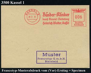 2392 | 35 € | 3500 Kassel Absender-Freistempel : KASSEL 1/ Bünder-Klinker/ ..Heinrich Walter,Kassel 1938 (28.3.) AFS-Musterabdruck Francotyp "Reichsadler" , glasklar gest. Francotyp-Musterblatt vom (Vor)-Ersttag!, selten! (Dü.E-5CGo) | ![]() ![]() | |
