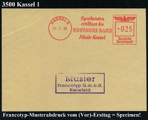 2396 | 35 € | 3500 Kassel Absender-Freistempel : KASSEL 1/ Sparkonten../ DEUTSCHE BANK/ Filiale Kassel 1938 (24.9.) AFS Francotyp "Reichsadler" , glasklar gest. Francotyp-Musterblatt vom (Vpr)-Ersttag!, selten! (Dü.E-5DGo) | ![]() ![]() | |