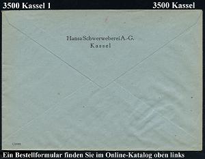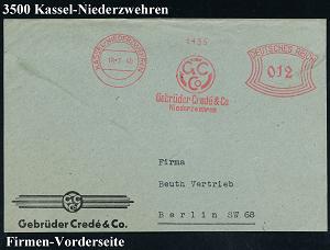 2405 | 18 € | 3500 Kassel Absender-Freistempel : KASSEL-NIEDERZWEHREN/ CG Co/ Gebrüder Credé & Co.. 1940 (18.7.) AFS Francotyp "Bogenrechteck" (Firmen-Logo) auf motivgleicher Firmen-Vorderseite (Dü.E-1CAh) | ![]() | |