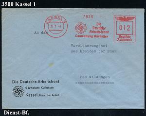 2406 | 20 € | 3500 Kassel Absender-Freistempel : KASSEL 1/ Die/ Deutsche/ Arbeitsfront/ Gauwaltung Kurhessen 1941 (21.7.) AFS Francotyp "Reichsadler" (Hakenkreuz-Zahnrad) motivgleicher Dienst-Bf. (Dü.E-5CGh) | ![]() | |