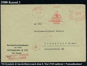 2410 | 30 € | 3500 Kassel Absender-Freistempel : KASSEL/ 1/ ..WEGMANN & Co.. 1946 (5.4.) seltener, aptierter AFS Francotyp "Bogenrechteck", Inschrift "DEUTSCHES REICH" entfernt = Notmaßnahme! (Firmen-Logo) Firmen-Bf.: Betriebskrankenkasse der Firma WEGMANN & CO.. (Dü.E10 C-58h) | ![]() | |