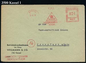 2416 | 20 € | 3500 Kassel Absender-Freistempel : KASSEL/ 1/ ..W.WEGMANN & Co.. 1946 (21.12.) seltener AFS-Typ Francptyp "Hochrechteck" (Firmen-Logo) Firmen-Bf.: Betriebskrankenkasse der Firma WEGMANN & CO.., vergl. Nr.2410 (Dü.E-18CGh, nur ca. 1 1/2 Jahre verwendet!) | ![]() | |