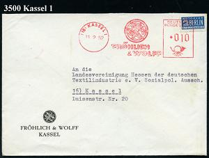 2427 | 14 € | 3500 Kassel Absender-Freistempel : (16) KASSEL 1/ FRÖHLICH/ & WOLFF 1952 (11.2.) AFS Francotyp "Posthorn" (= Spindel, 2 Weberschiffchen) auf 2 Pf. NoB (VE), motigvl. Firmen-Bf. (Dü.E-23DG mit Raute) | ![]() | |
