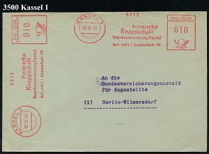 2430 | 16 € | 3500 Kassel Absender-Freistempel : KASSEL 1/ Hessische/ Knappschaft.. 1956 (7.12.) aptierter AFS Francotyp "Posthorn" mit alter Zählnr., 1 Wort aus dem Klischee entfernt, 010 Pf. + 010 Pf. = 2 Abdrucke , Inl.-Bf. n. West-Berlin (Dü.E-23CGh) | ![]() | |