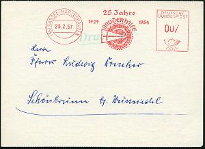 2432 | 18 € | 3500 Kassel Absender-Freistempel : (16) KASSEL-HARLESHAUSEN/ 25 Jahre/ 1929 1954/ BRUDERHILFE 1957 (25.2.) Jubil.-AFS Francotyp "Posthorn" = Kreuz-Wimpel , rs. motivgl. Zudruck: Vereinigung kraftfahrender Pfarrer, Fern-Kt. (Dü.E-23CO) | ![]() ![]() | |