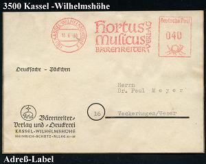 2426 | 25 € | 3500 Kassel Absender-Freistempel : (16) KASSEL-WILHELMSHÖHE 1/ Hortus/ Musicus/ BÄRENREITER-/ VERLAG 1950 (13.6.) AFS Francotyp "Posthorn" 040 Pf. auf Verlags-Adreßzettel: Bärenreiter-Verlag u. Druckerei.. (Firmen-Logo) = seltene Portostufe , 6. Gew.-Stufe Drucksache (Götz + 125.- DM, 1981), seltener Beleg! (Dü.E-20CGo) | ![]() | |