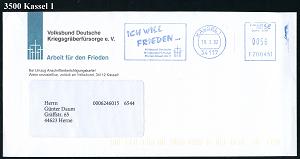 2454 | 8 € | 3500 Kassel Absender-Freistempel : 34112 KASSEL 1/ F7000451/ ICH WILL/ FRIEDEN-/ Volksbund Deutsche/ Kriegsgräberfürsorge.. 2002 (19.2.) blauer AFS Postalia (Kreuz-Logo) motivgl. Vordruck-Bf. | ![]() | |