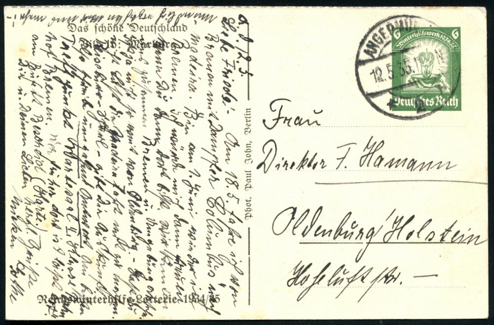 2561 | 15 € | 3550 MARBURG : Marburg/ Lahn 1935 (12.5.) 6 Pf. BiP WHW-Lotterie, grün: Elisabeth-Kirche u. Landgrafen-Schloß etc., (gest. Angermünde) Bedarf (Mi.P 254/16) | ![]() ![]() | |