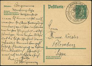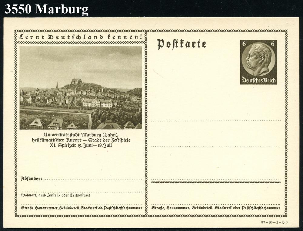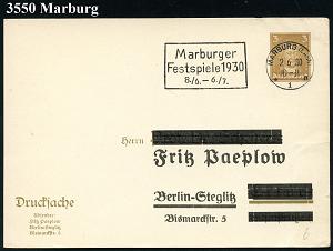 2558 | 18 € | 3550 MARBURG : MARBURG (LAHN)/ *1n/ Marburger/ Festspiele 1930/ 8.6.-6.7. 1930 (11.6.) MWSt = Festspiele der Hl. Elisabeth auf PP 3 Pf. Goethe, braun: Fritz Papeplow.. (alte Adr. geschwärzt, Mi.PP 07/B 6), kl. Beförd.-Spuren, klar gest. Inl.-Kt. (Bo.6 A) | ![]() | |