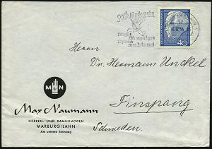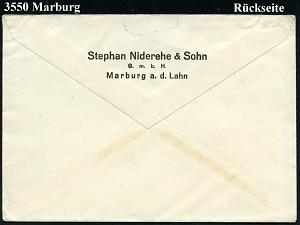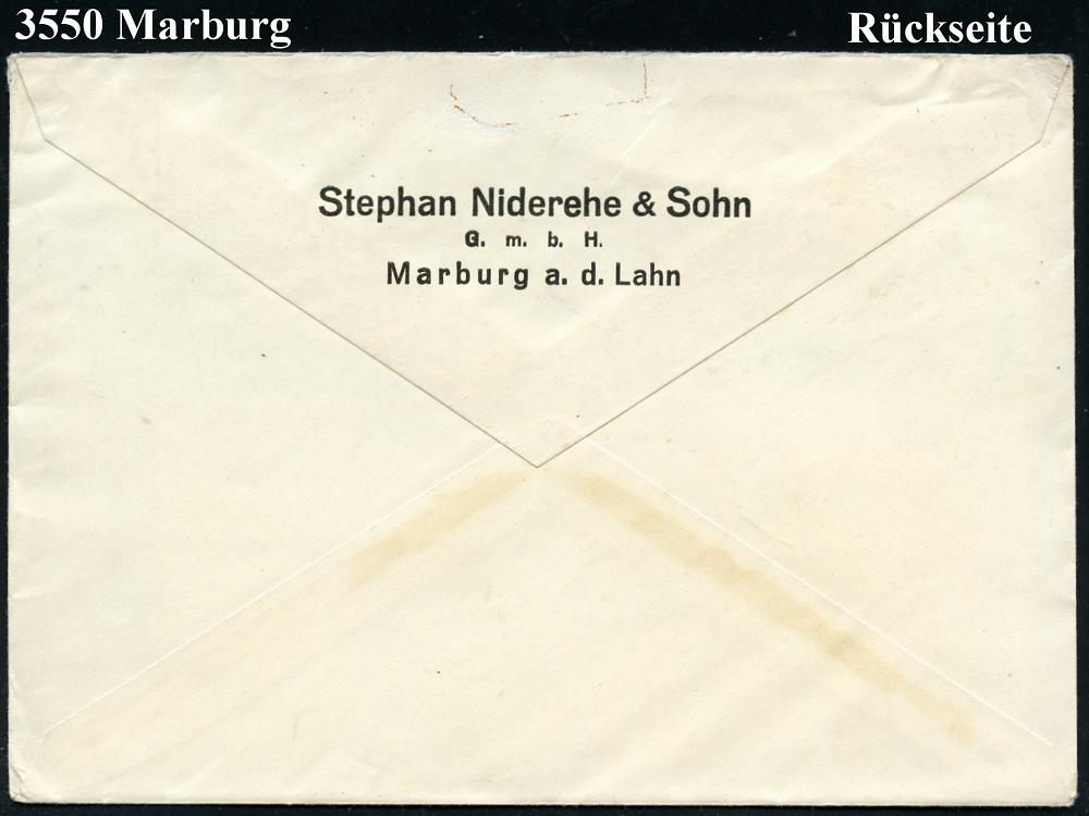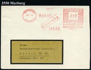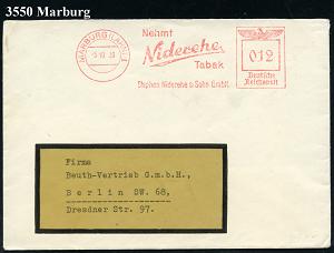 2595 | 18 € | 3550 MARBURG : MARBURG (LAHN) 1/ Nehmt/ Niderehe/ Tabak/ Stephan Niderehe & Sohn GmbH 1939 (5.10.) AFS Francptyp "Reichsadler" , rs. Abs.-Vordruck, Fern-Bf. (Dü.E-5CEo) | ![]() ![]() ![]() | |