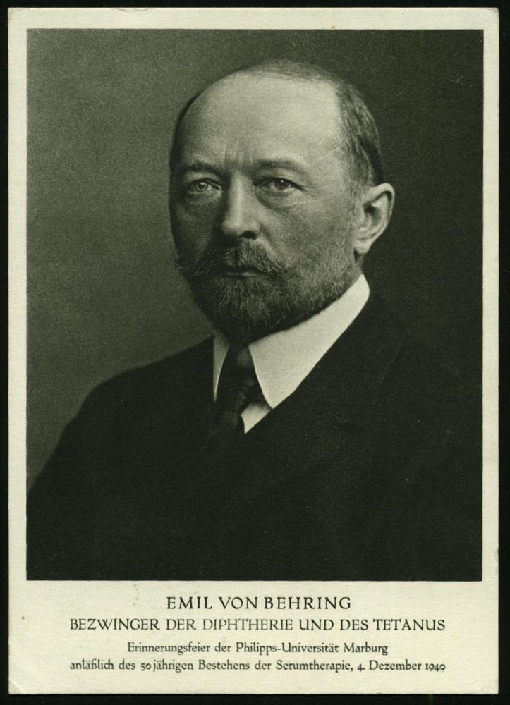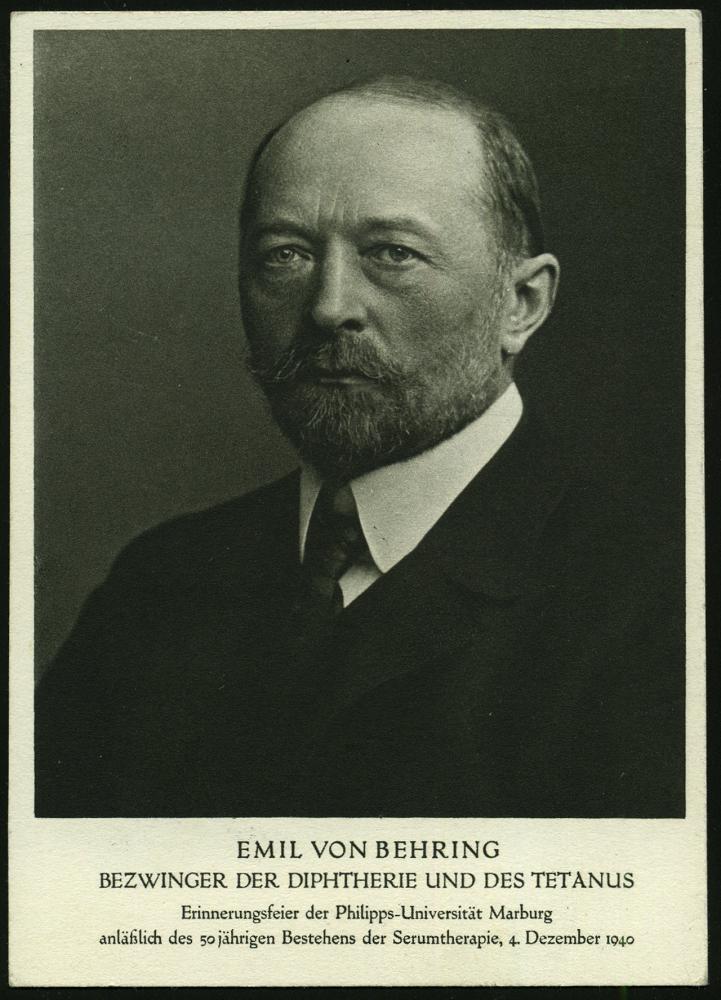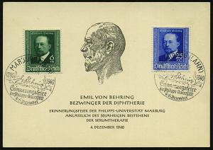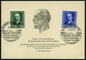 2565 | 20 € | 3550 MARBURG : MARBURG (LAHN)/ E v Behring/ a/ Erinnerungsfeier... 1940 (4.12.) SSt auf kompl. Satz E. v. Behring = Nobelpreis 1901 (Mi.760/61) vs. auf Gedenkblatt "Emil v. Behring, Bezwinger der Diphterie.." (Bo.8 a) | ![]() | |