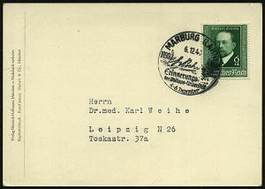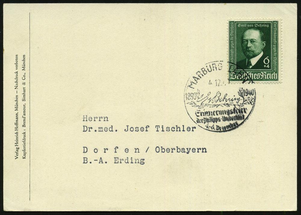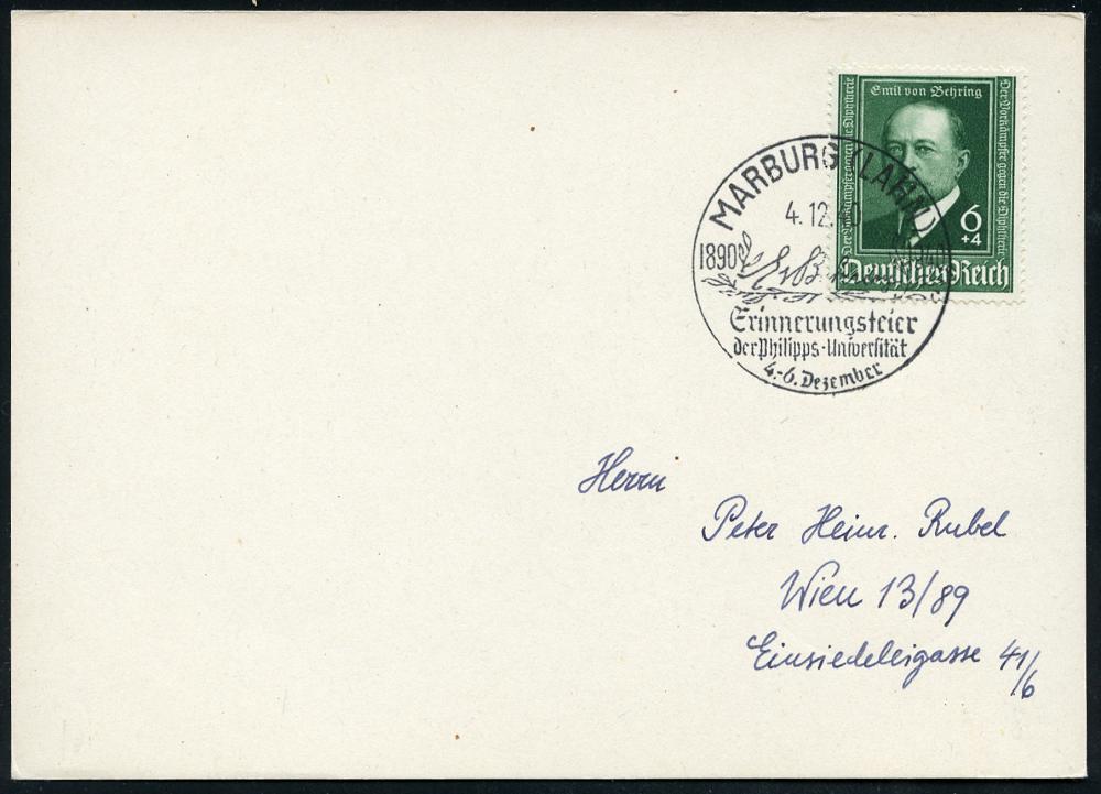 2567 | 18 € | 3550 MARBURG : MARBURG (LAHN)/ E v Behrens/ d/ Erinnerungsfeier... 1940 (4.12.) SSt mit UB "d" auf EF 6 + 4 Pf. Emil v. Behring = Nobelpreis 1901 (Mi.760 EF) klar gest. portorichtige Inl.-Kt. (Bo.8 d) | ![]() | |