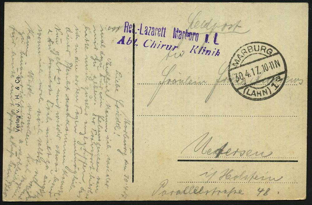 2550 | 14 € | 3550 MARBURG : MARBURG/ (LAHN)1/ a 1917 (30.4.) 1K-Brücke + viol. 2L: Res.-Lazarett Marburg a. L./ Abt. Chirur. Klinik , klar gest. s/w.-Feldpost-Ak. (Lahnpartie) n. Uetersen | ![]() ![]() | |