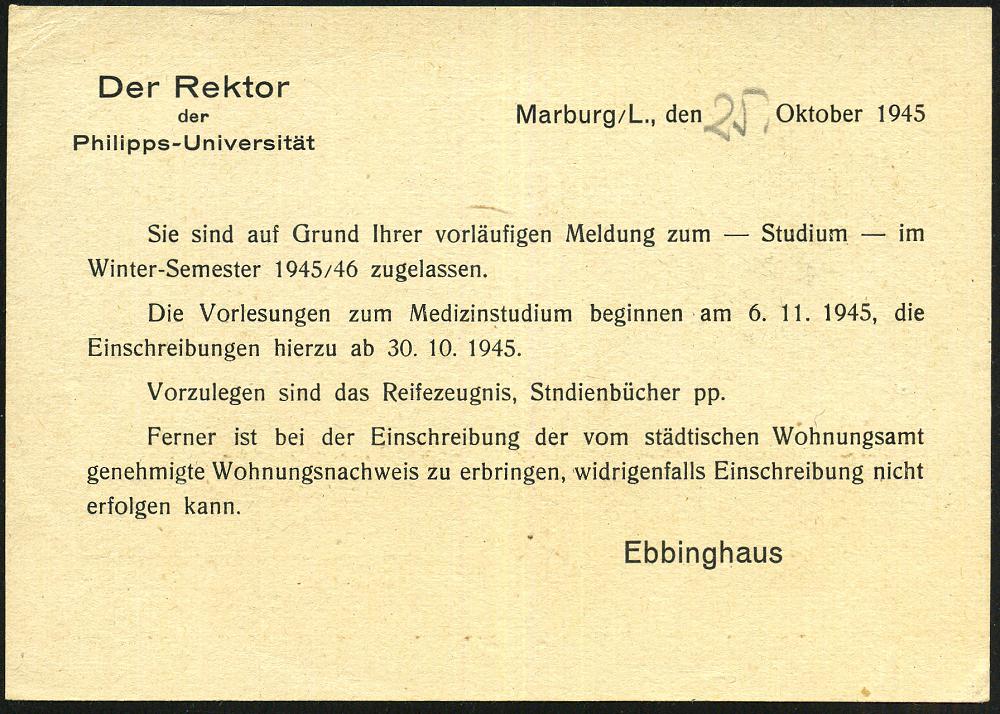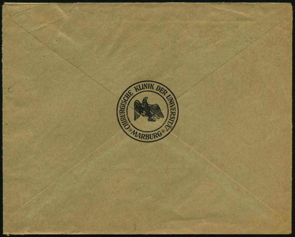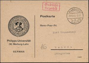 2596 | 25 € | 3550 MARBURG : MARBURG/ d/ (LAHN)2 1945 (29.10.) 1K-Brücke + roter Ra.2: Gebühr/bezahlt , dekorative Dienst-Kt.: Philipps-Universität.. (Gründer-Portrait) betr. Medizin-Studium, Fernkt., seltene, frühe Nachkriegsv-Barfrankaturerwendung! | ![]() ![]() | |