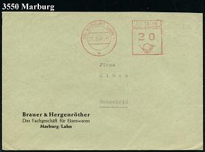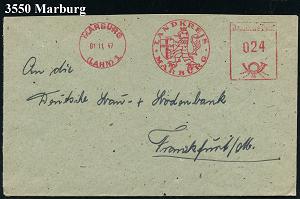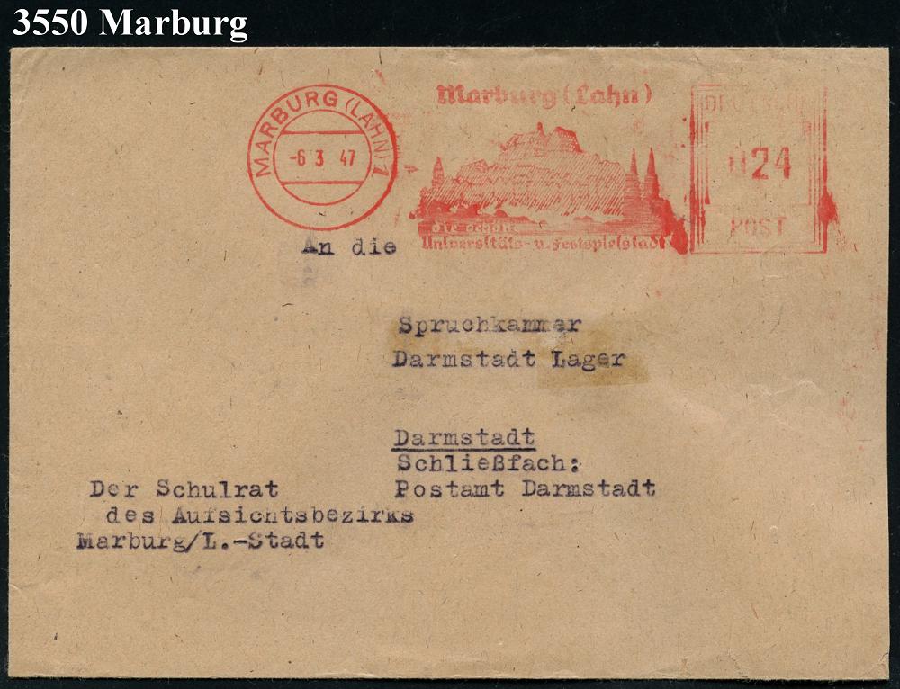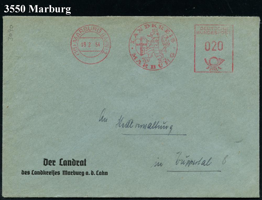 2603 | 20 € | 3550 MARBURG : MARBURG/ (LAHN) 1/ LANDKREIS/ MARBURG 1947/54 2 verschiedene AFS Francotyp "Posthorn - Deutsche Post" bzw. DEUTSCHE/BUNDESPOST (je hess.Wappenlöwe mit Kreuzwappen) 2 Dienst-Briefe (Dü.E-20CG, E-23CO) | ![]() ![]() | |