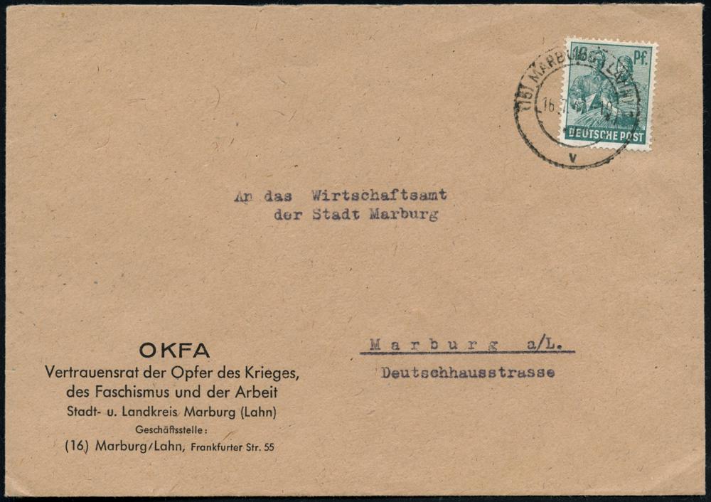 2571 | 18 € | 3550 MARBURG : (16) MARBURG (LAHN) 1/ v 1947 (16.7.) 2K-Steg auf Dienst-Bf.: OKFA, Vertrauensrat der Opfer des Krieges, des Faschismus und der Arbeit.. , seltener Orts-Bf. (Mi.949) | ![]() | |