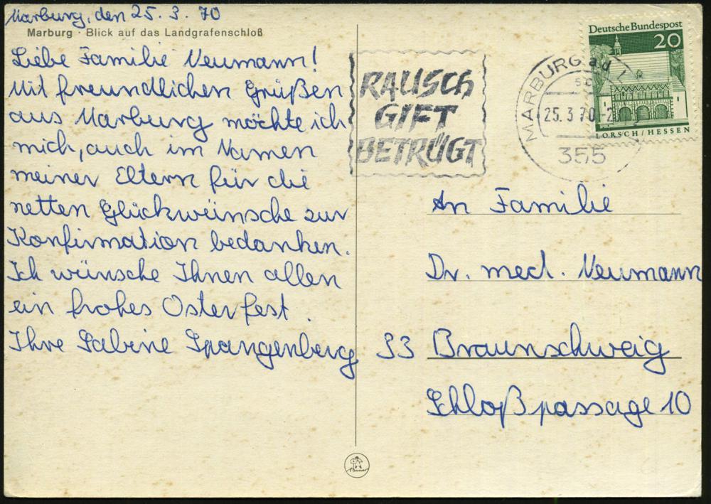 2575 | 14 € | 3550 MARBURG : 355 MARBURG a.d.LAHN 1/ sb/ 7/ ZEICHEN/ warnen vor/ Krebs 1967 (26.7.) MWSt (Familie) Inl.-Bf. (Bo.S 1172 A , nur in 2 Orte verwendet!) | ![]() | |