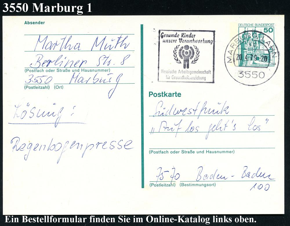 2579 | 6 € | 3550 MARBURG : 3550 MARBURG,LAHN 1/ sb/ Gesunde Kinder/ unsere Verantwortung.. 1979 (20.4.) MWSt (WHO-Logo) Bedarf (Bo.S 1320 A , nur in 6 hess. Orten verwendet) | ![]() | |