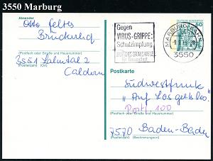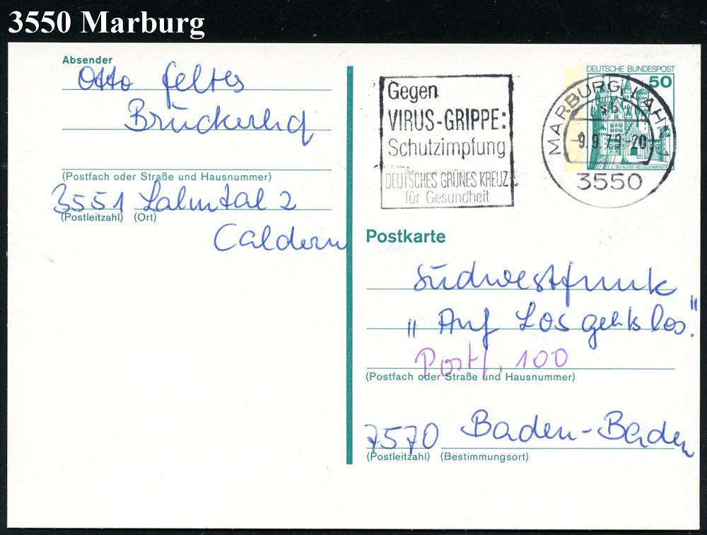 2580 | 8 € | 3550 MARBURG : 3550 MARBURG,LAHN 1/ sb/ Gegen/ VIRUS-GRIPPE:/ Schutzimpfung/ DT.GRÜNES KREUZ 1979 (9.9.) MWSt , Bedarfs-Kt. (Bo.S 1326 A, nur in 4 hess. Orten verwendet) | ![]() | |