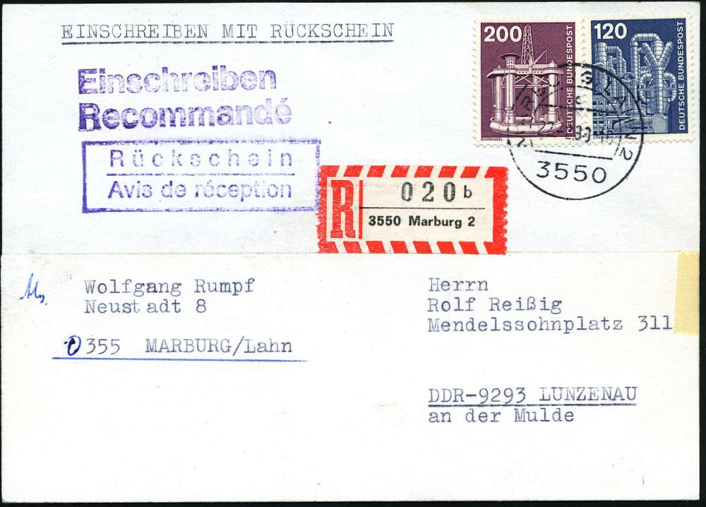 2581 | 28 € | 3550 MARBURG : 3550 MARBURG, LAHN 2/ c 1980 (22.2.) 1K-Segment auf satzreiner Frankatur 120 Pf. u. 200 Pf. Technik + RZ: 3550 Marburg 2/b, sehr seltene Inl.-R-Kt "Rückschein" in die DDR.!, seltene Portostufe! (Mi.855, 858) | ![]() | |