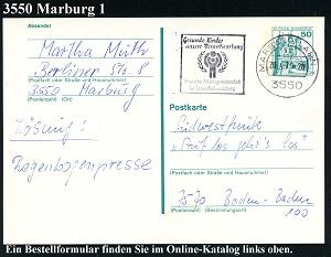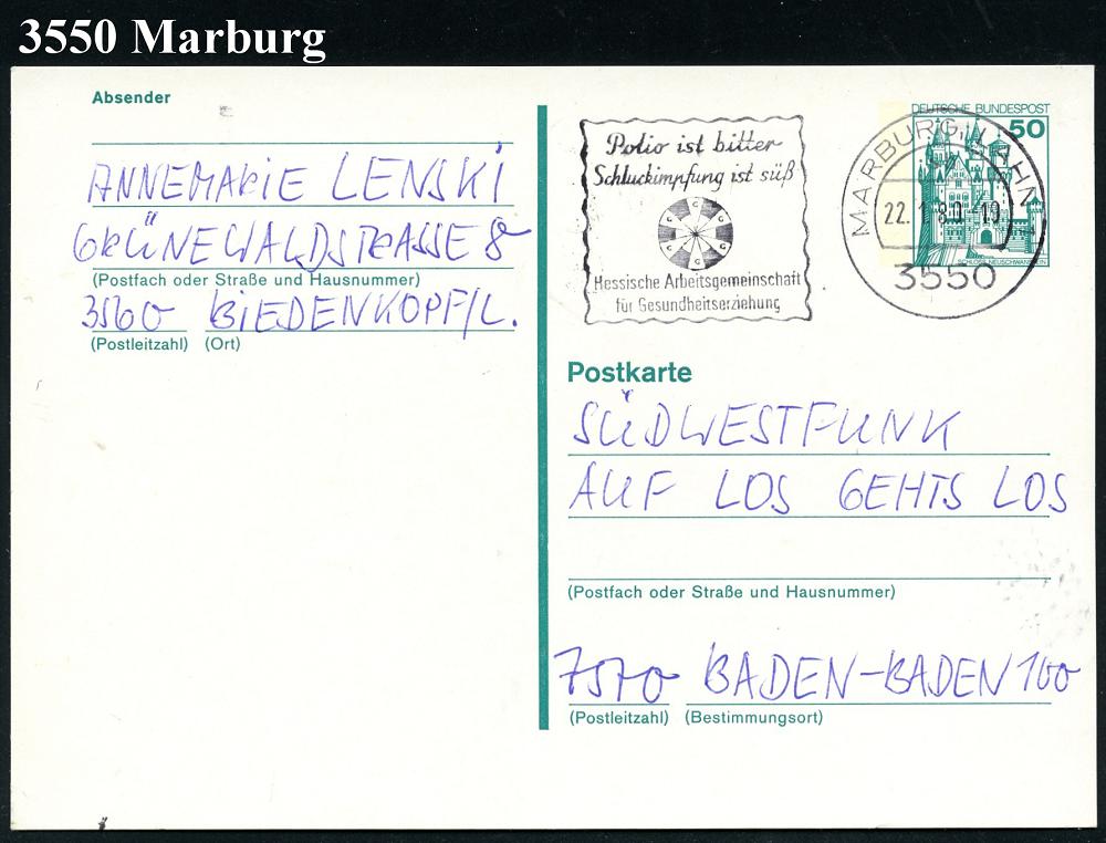 2583 | 6 € | 3550 MARBURG : 3550 MARBURG,LAHN 1/ sb/ polio ist bitter/ Schluckimpfung ist süß.. 1980 (Jan.) MWSt (Logo) Bedarfs-Kt. (Bo.S 1218 A ,in nur 3 hessischen Orten verwendet!) | ![]() | |