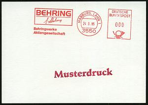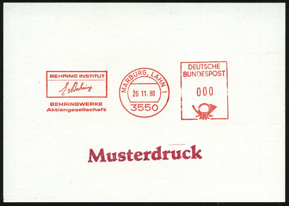 2606 | 25 € | 3550 MARBURG : 3550 MARBURG,LAHN 1/ BEHRING/ E v Behring #bzw.# BEHRING INSTITUT/ E v Behring 1980/85 2 verschiedene AFS, je 000 (je Schriftzug "E v Behring") + 1L: Musterdruck (Einzelverkauf möglich: je 15.- EUR) 2 Muster-Karten (Dü.E-26B) | ![]() ![]() | |