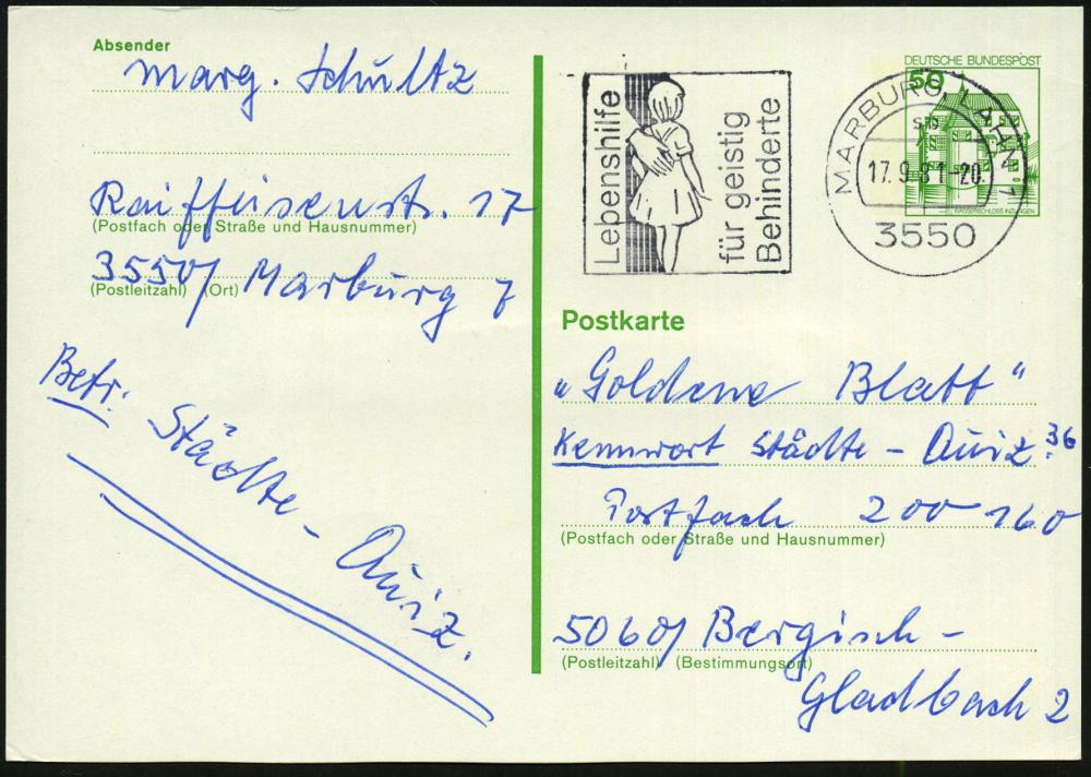 2585 | 10 € | 3550 MARBURG : 3550 MARBURG,LAHN 1/ sb/ Lebenshilfe/ für geistig/ Behinderte 1981 (Sept.) MWSt (Hand schützt Kind) Bedarfskt. (Bo.39 A , nur 30 Tage verwendet!) | ![]() | |