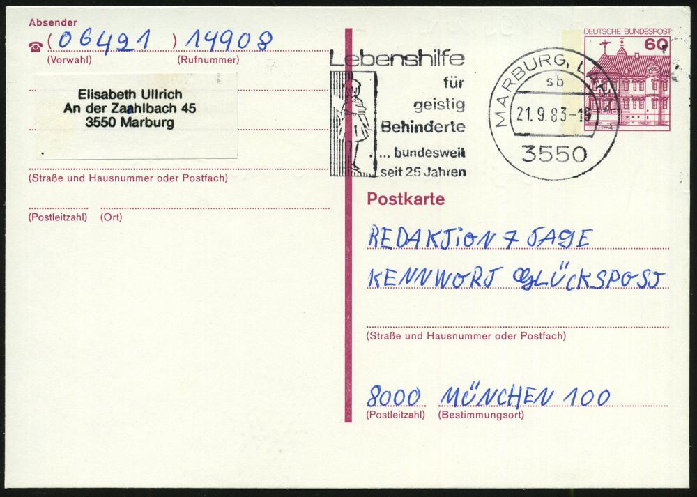 2590 | 8 € | 3550 MARBURG : 3550 MARBURG,LAHN 1/ sb/ Lebenshilfe/ f./ geistig/ Behinderte/ ..seit 25 Jahren 1983 (21.9.) MWSt (Hand schützt Kind) Bedarfskt. (Bo.39 A , nur 3 Monate verwendet) | ![]() | |