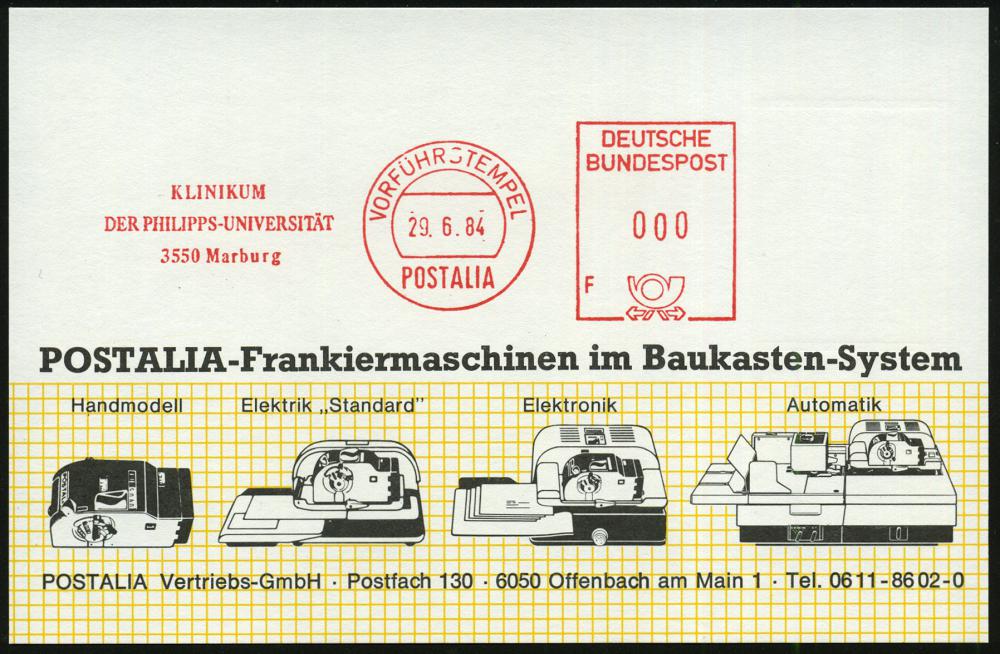 2609 | 18 € | 3550 MARBURG : 3550 Marburg 1984 (29.6.) AFS.: VORFÜHRSTEMPEL/POSTALIA/F/KLINIKUM/DER PHILIPPS-UNIVERSITÄT , seltene Postalia-Musterkt.! (= Specimen) | ![]() | |