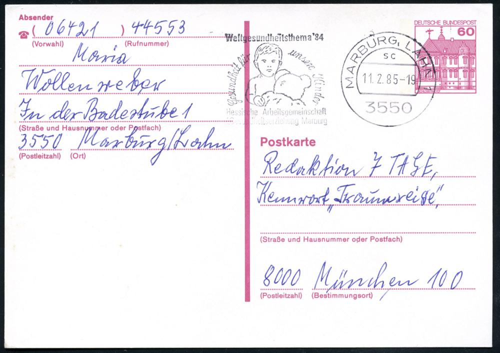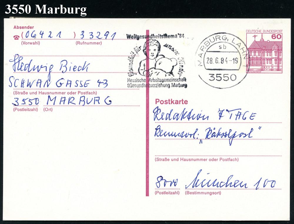 2584 | 6 € | 3550 MARBURG : 3550 MARBURG,LAHN 1/ sb/ Weltgesundheitsthema´84/ Gesundheit für unsere Kinder.. 1084 (28.6.) MWSt (Kind mit Teddybär) Bedarfs-Kt. (Bo.S 1378 A, 1 Jahr verwendet) | ![]() | |