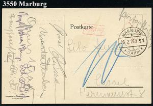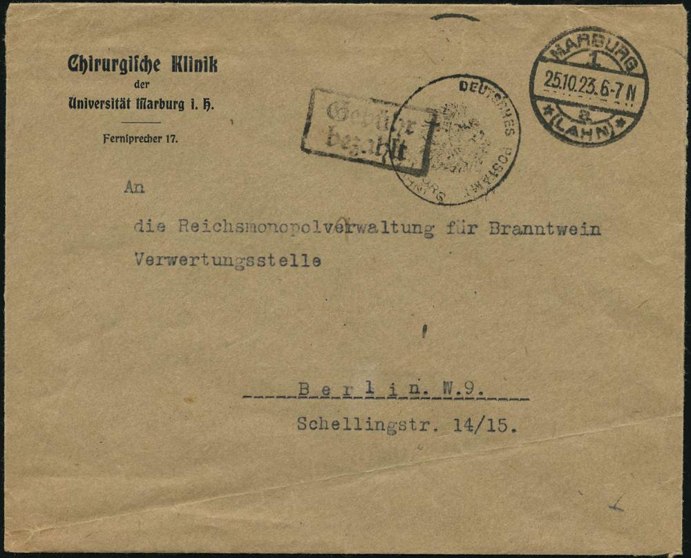 2552 | 22 € | 3550 MARBURG : MARBURG/ 1/ *(LAHN)* 1923 (25.10.) 1K-Brücke + schw. Ra.2: Gebühr/bezahlt , Dienst-Bf.: Chirurg. Klinik d. Universität + aptierter Dienst-HdN: DEUTSCHES POSTAMT/MARBURG/(LAHN) ("KAISERL" entfernt) portofreier Infla-Dienst-Bf.! (an Monopolverwaltung-Branntwein) | ![]() ![]() | |