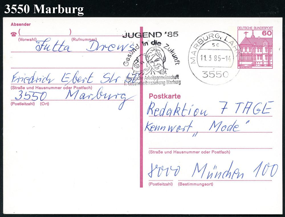 2592 | 6 € | 3550 MARBURG : 3550 MARBURG,LAHN/ sc/ JUGEND´85/ Gesund in d.Zukunft.. 1985 (11.5.) MWSt (2 Jugendliche) Bedarfs-Kt. (nur 1985 verwendet) | ![]() | |