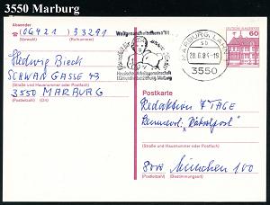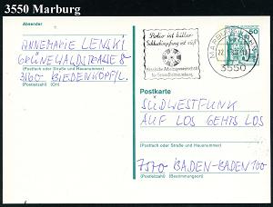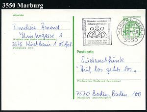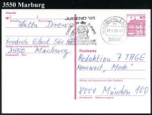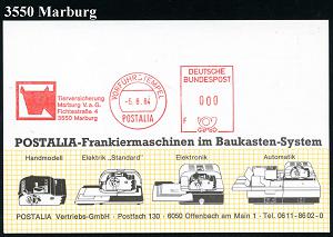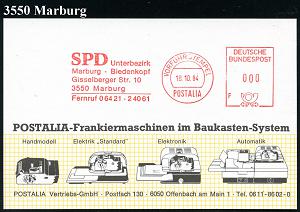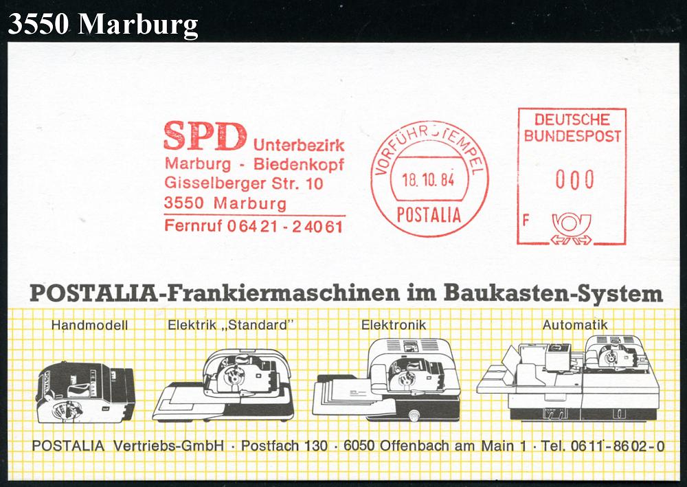 2611 | 18 € | 3550 MARBURG : 3550 Marburg 1984 (18.10.) AFS: VORFÜHRSTEMPEL/POSTALIA/F/SPD/Unterbez./Marburg-Biedenkop.. , seltene Postalia-Musterkt.! (= Specimen) | ![]() | |