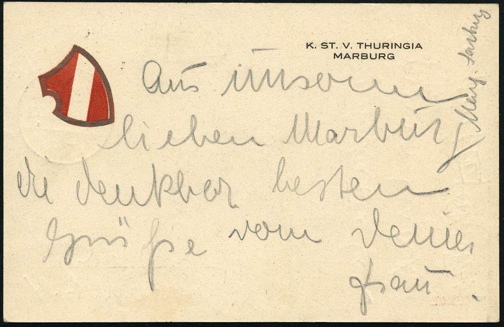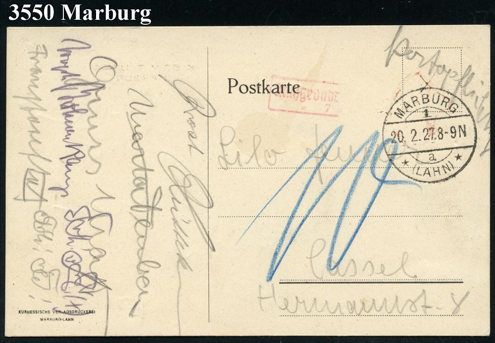 2553 | 20 € | 3550 MARBURG : MARBURG/ 1/ a/ *(LAHN)* 1927 (20.2.) 1K-Brücke + roter Ra.: Nachgebühr + hs. Vermerk "Portopflichtig" (Nachgebühr "10" Pf.) auf Color-Litho-Studentenverbindungs-Ak.: K. ST. V. THURINGIA (Wappen) Fern- Nachporto-Kt. | ![]() ![]() | |