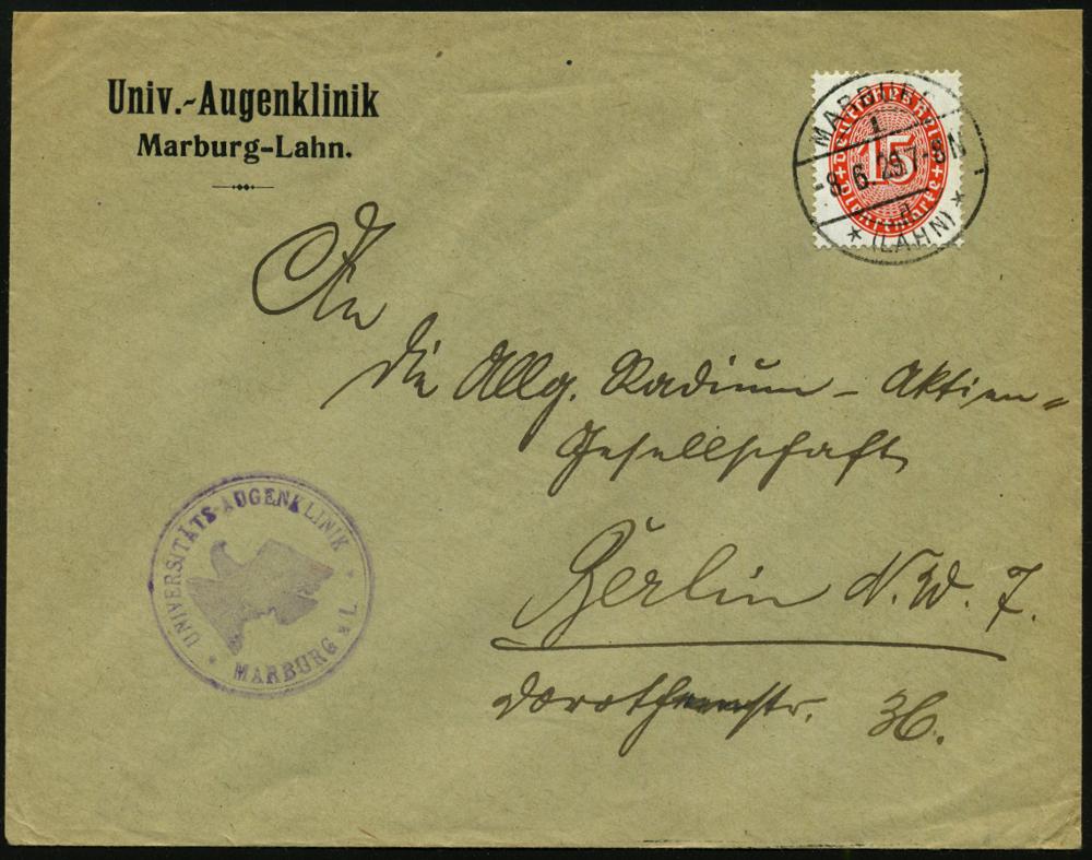 2557 | 16 € | 3550 MARBURG : MARBURG/ 1/ a/ *(LAHN)* 1929 (8.6.) 1K-Brücke + viol. 2K-HdN: UNIVERSITÄTS-AUGENKLINIK.. (preuss.Adler) klar gest. Dienst-Bf., rs. gedrucktes Dienstsiegel! (Mi.D 118 EF) | ![]() ![]() | |