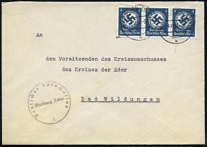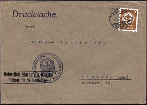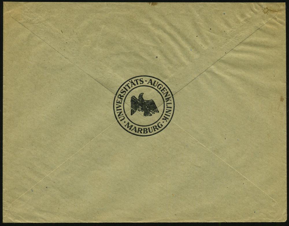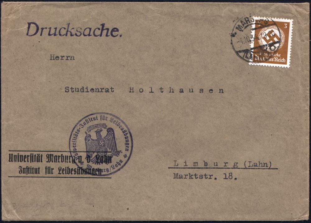 2560 | 20 € | 3550 MARBURG : Marburg/ Lahn 1934 (1.10.) Dienst-Vordr.Bf: Universität../Jnstitut für Leibesübungen + viol. HdN: ..Institut für Leibesübungen/ Gott mit uns (preuß. NS-Adler) Orts-Drs. (Mi.D 132 EF) | ![]() | |