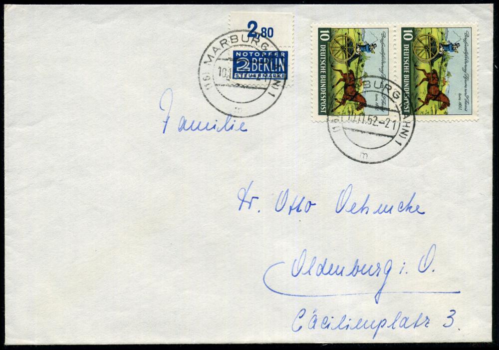 2572 | 18 € | 3550 MARBURG : (16) MARBURG 1/ m 1952 (10.11.) 2K-Steg 2x auf 10 Pf. "100 Jahre Thur- & Taxis-Marken", reine MeF: Paar (= Karriol-Postagen) Inl.-Bf. (Mi.160 MeF, + 12.- EUR) | ![]() | |