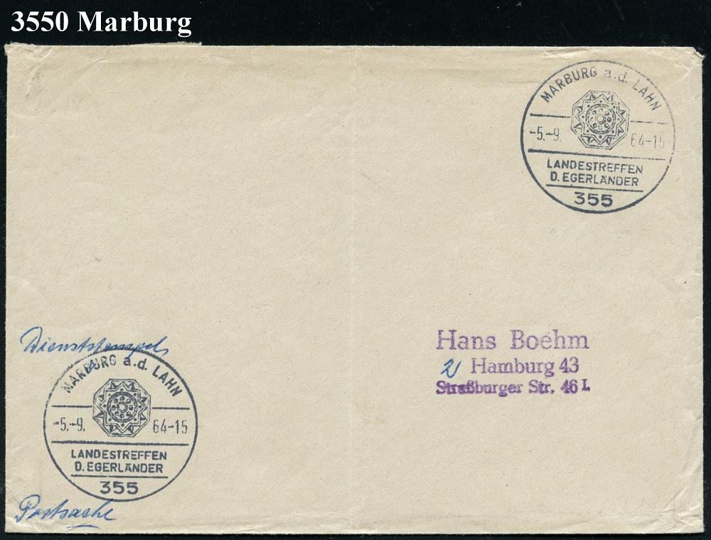 2573 | 12 € | 3550 MARBURG : 355 MARBURG a.d.LAHN/ LANDESTREFFEN/ D.EGERLÄNDER 1964 (5.9.) SSt (Ornament) 2x auf Postdiens-Antwortbf., daher gafaltet (Bo.18) | ![]() | |