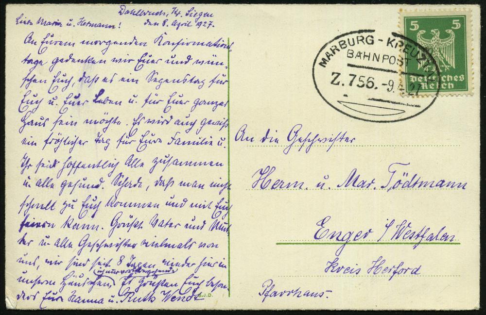 2554 | 14 € | 3550 MARBURG : MARBURG-KREUZTAL/ BAHNPOST/ Z.756 1927 (9.4.) Bahn-Oval mit Segment (unten) klar auf Fern-A. mit Bibel-Zitat n. Enger/Westf. | ![]() ![]() | |