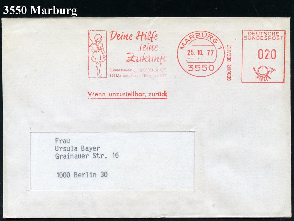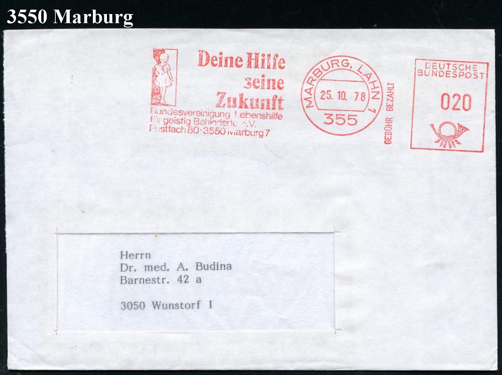 2605 | 10 € | 3550 MARBURG : 355 MARBURG,LAHN 1/ GEBÜHR BEZAHLT/ Deine Hilfe/ seine/ Zukunft/ Bundesvereinigung Lebenshilfe.. 1978 (25.10.) AFS Francotyp 020 Pf. = Massen-Drs. (Hand schützt Kind) Fern-Bf. (Dü.E-26) | ![]() | |