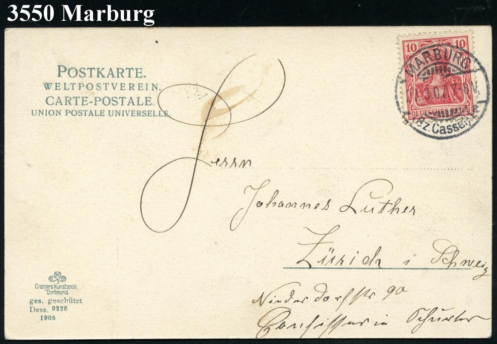 2549 | 15 € | 3550 MARBURG : MARBURG/ (Bz.CASSEL)/ a 1908 (27.3.) 1K-Gitter auf EF 10 Pf. Germania, rot, s/w.-Foto-Ak.: Partie am Schloß , klar gest. Ausl.-Karteä n. Zürich (Mi.86 I) | ![]() ![]() | |