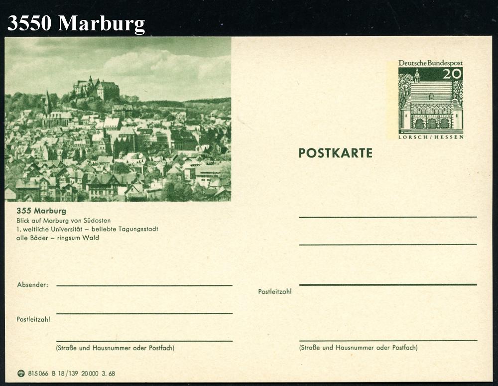2576 | 6 € | 3550 MARBURG : 355 Marburg 1968 20 Pf. BiP Lorsch, grün: .. 1. weltliche Universität , ungebr. (Mi.P 96) | ![]() | |
