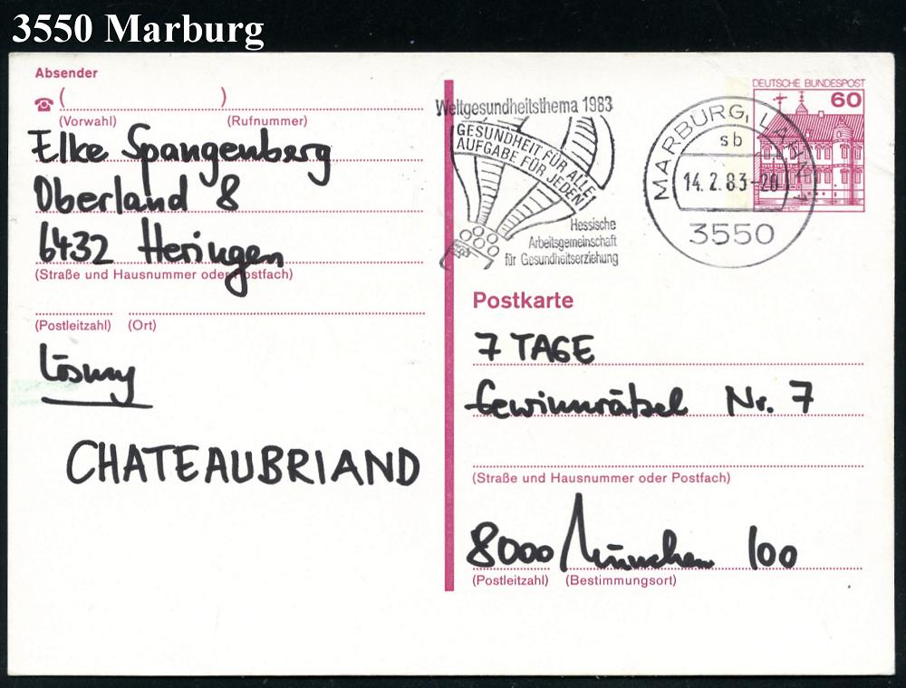 2589 | 5 € | 3550 MARBURG : 3550 MARBURG.LAHN 1/ sb/ Welrgesundheitsthema 1983/ GESUNDHEIT FÜR ALLE.. 1983 (14.2.) MWSt (Ballon) Bedarfs-Kt. (Bo.S 1364 A, 11 Monate in 7 hess. Orten verwendet) | ![]() | |