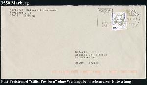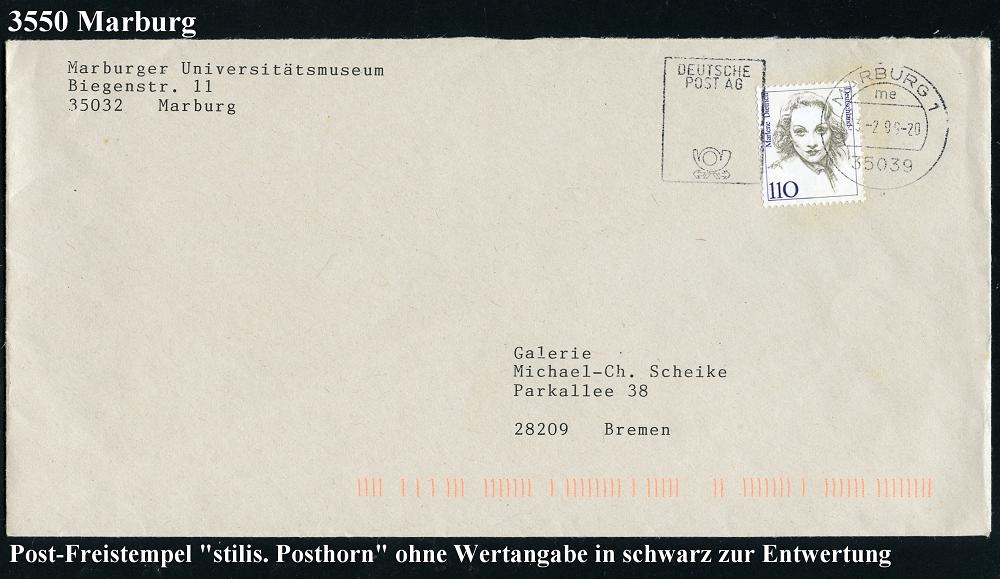 2593 | 10 € | 3550 MARBURG : 35039 MARBURG 1/ me/ DEUTSCHE BUNDESPOST 1999 (23.2.) scharzer Post-Freistemepl "stilis. Posthorn" o h n e Wertziffer als Entwertung auf Bedarfs-Bf. | ![]() | |