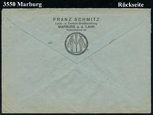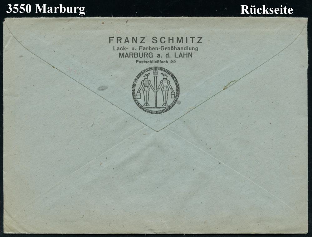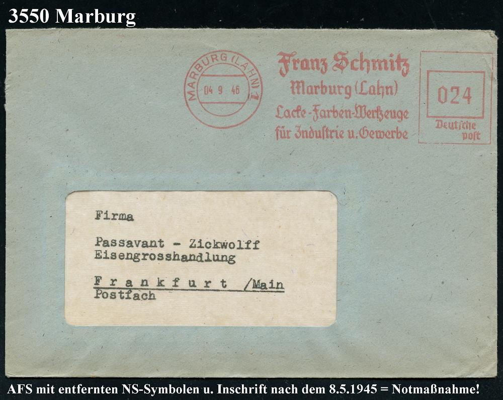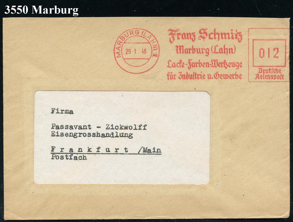 2598 | 22 € | 3550 MARBURG : MARBURG (LAHN) 1/ Franz Schmitz/ ..Lack-Farben-Werkzeuge/ für Jndustrie-u.Gewerbe 1946 (4.9.) AFS Francotyp "Reichsadler" = entfernt + "Reichs" = Notmaßnahme! (vergl. Nr.2597) rs. Abs.-Vordruck mit Firmen-Logo) Fern-Bf. (Dü.E-13 Y-129o) | ![]() ![]() | |