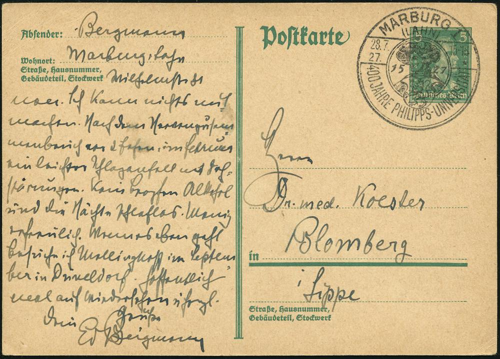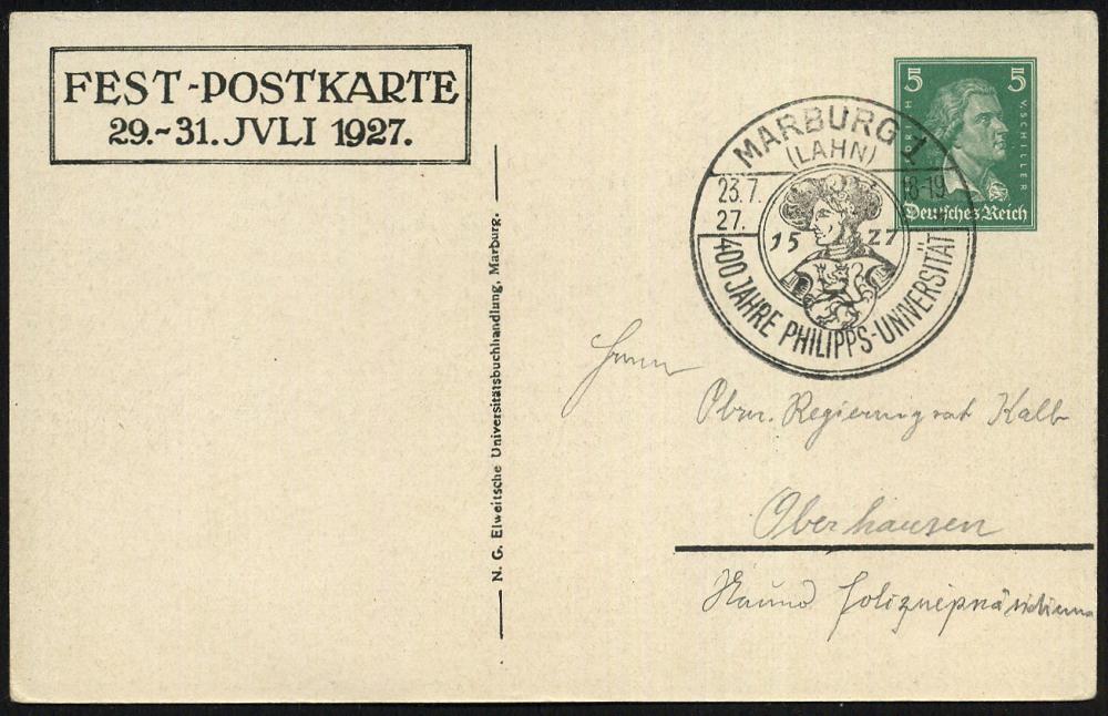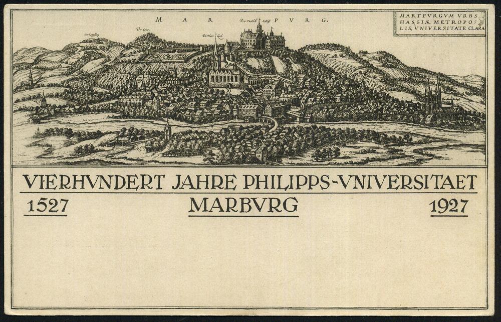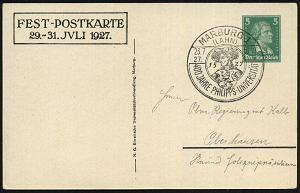 2556 | 35 € | 3550 MARBURG : MARBURG/ (LAHN)/ 400 JAHRE PHILIPPS-UNIVERSITÄT 1927 (23.7) SSt (Philipp der Großmütige) auf passender PP 5 Pf. Schiller: 400 Jahre Philipps-Universität 1527.. = Alt-Marburg mit Schloß von 1527, Philipp der Groß-mütige, Mitglied im Schmalkaldischen Bund, Verlierer im Schmalkaldischen Krieg 1546-47, Marburger Relgionsgespräch Luther - Zwingli etc. (Frech.PP 101/C 5-01) Inl.-Karte (Bo.3) | ![]() ![]() | |