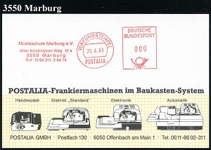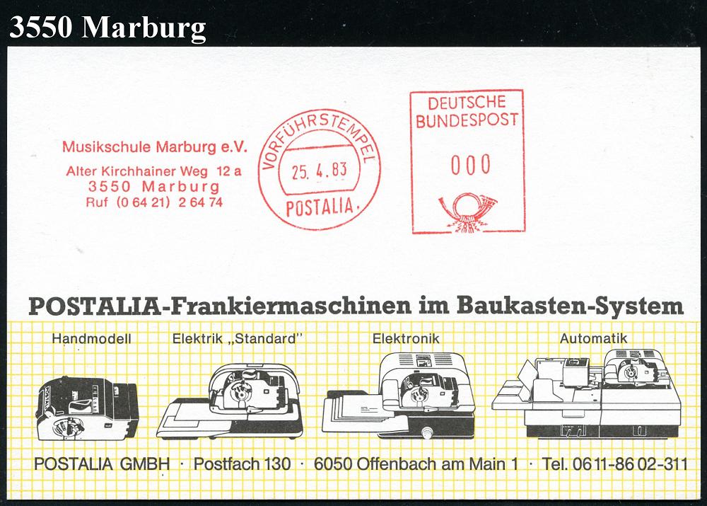 2607 | 18 € | 3550 MARBURG : 3550 Marburg 1983 (25.4.) AFS.: VORFÜHRSTEMPEL/POSTALIA/Musikschule Marburg e.V.. , seltene Postalia-Muster-Kt. (= Specimen) | ![]() | |