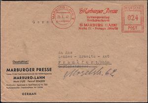2600 | 20 € | 3550 MARBURG : MARBURG (LAHN)1/ Marburger Presse/ Zeitungsverlag.. 1947 (29.1.) seltener AFS-Typ Francotyp "Hochrechteck" klar auf Firmen-Bf. mit Zulassungsvermerk: Lizenz 10 der Nachrichtenkontrolle der Militärregierung.., klar gest. Fernbf. (Dü.E-18CG, nur 1 1/2 Jahre verwendet) | ![]() | |