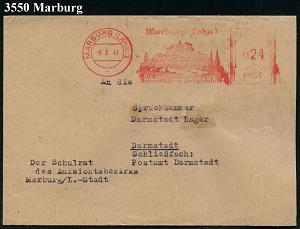 2601 | 20 € | 3550 MARBURG : MARBURG (LAHN) 1/ Universitäts-u.Festspielstadt 1947 (6.3.) seltener AFS Francotyp "Hochrechteck" (Stadtsilhouette) Dienst-Bf.: Der Schulrat des Aufsichtsbezirkes.. an das Lager Darmstadt für NS-Belastete! (Dü.E-18CG , nur 1 1/2 Jahre) | ![]() | |