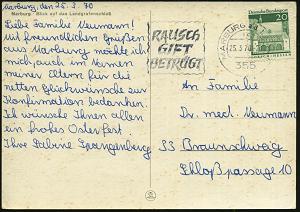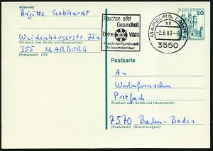 2582 | 6 € | 3550 MARBURG : 3550 MARBURG,LAHN 1/ sb/ Rauchen oder/ Gesundheit/ Deine Wahl 1980 (6.5.) MWSt , Bedarfs-Kt. (Bo.S 1335 A , nur in 5 hessischen Orten verwendet!) | ![]() | |